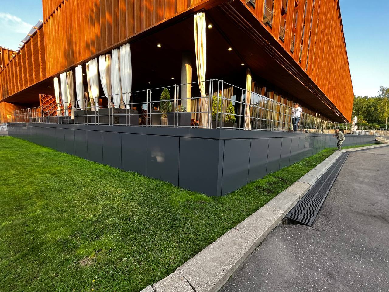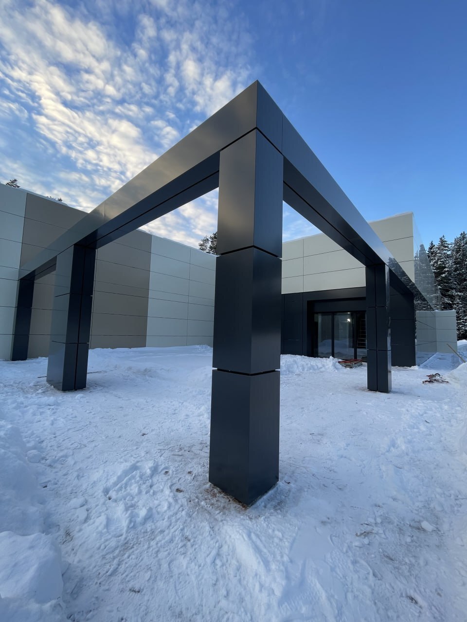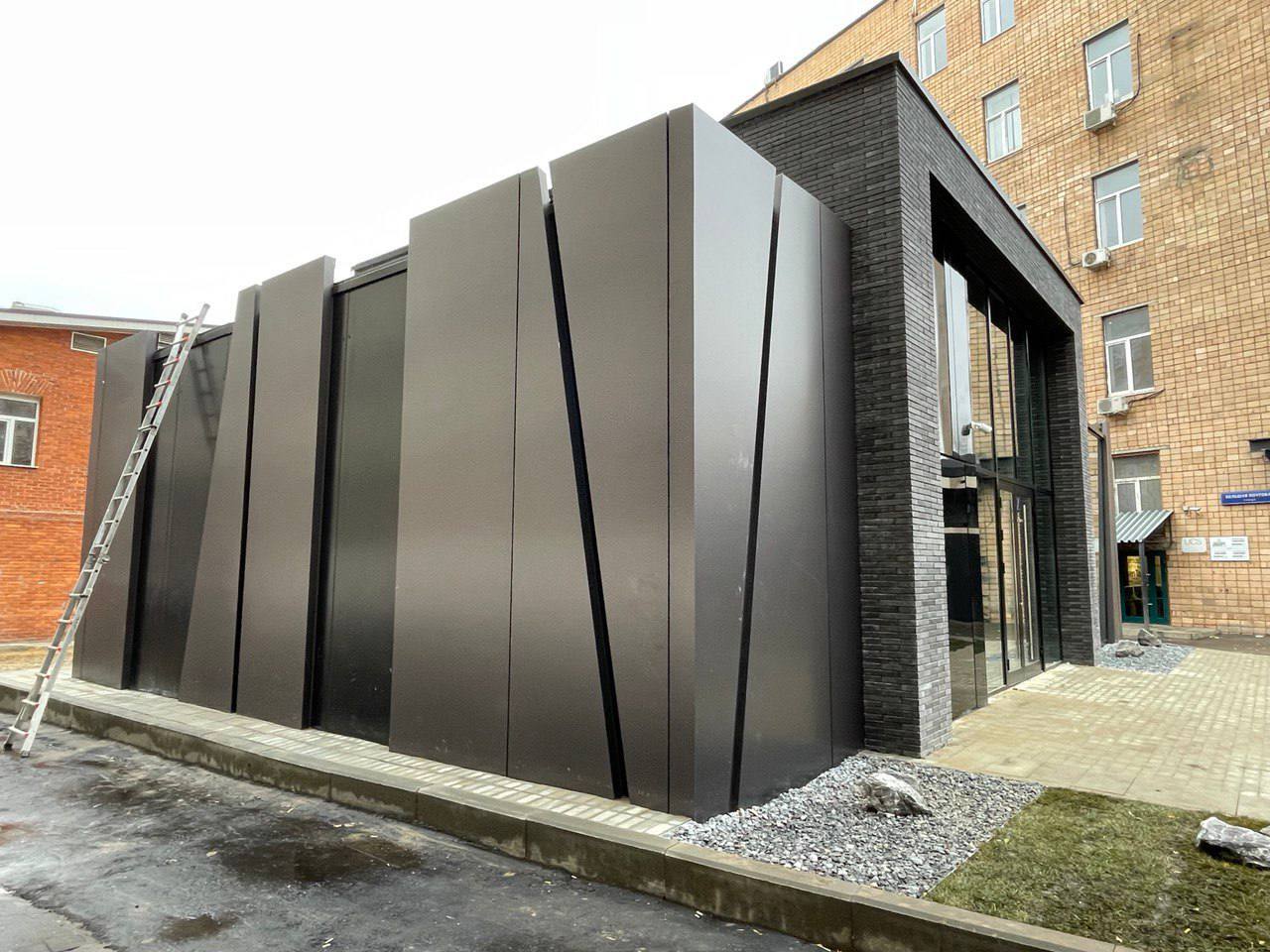 Стоимость устройства фасада формируется исходя из типа используемого материала и технологических особенностей его монтажа: резка и подгонка плитки при использовании керамогранита; раскрой, фрезеровка и последующая сборка фасадных панелей при использовании алюминиевых композитных панелей.